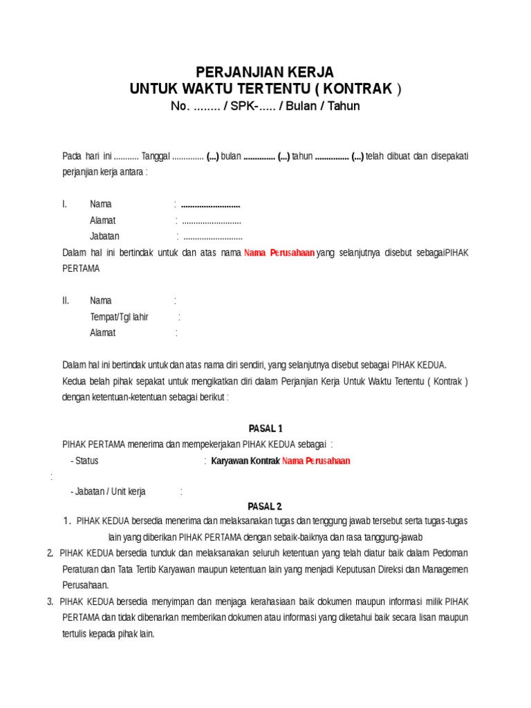 Oleh karena kontrak kerja merupakan acuan untuk karyawan dan perusahaan dalam bekerja sama, isi kontrak kerja merupakan hal yang penting dan dalam prakteknya harus dapat dipertanggungjawabkan. Setelah ditetapkan dan diberitahukan kepada penyedia barang/jasa yang terpilih, maka dilakukan penandatanganan kontrak berupa **surat perintah kerja (spk)** dari perusahaan yang akan ditandatangani oleh pejabat pembuat keputusan. Pkwt adalah perjanjian kerja dengan waktu yang sudah ditetapkan dan hanya boleh diperpanjang selama dua kali. Bahwa yang bertanda tangan di bawah ini: Tergantung jenis kontrak kerjanya seperti apa.