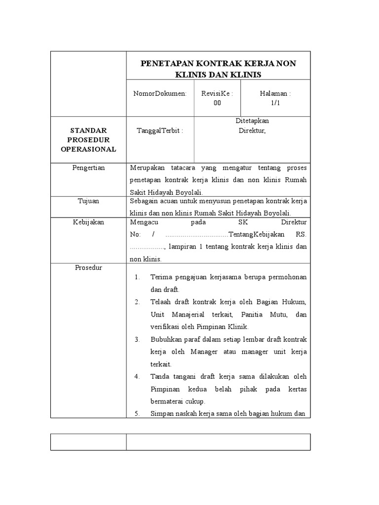 Setelah ditetapkan dan diberitahukan kepada penyedia barang/jasa yang terpilih, maka dilakukan penandatanganan kontrak berupa **surat perintah kerja (spk)** dari perusahaan yang akan ditandatangani oleh pejabat pembuat keputusan. Kontrak kerja tersebut merupakan sebuah awal dari terjalinnya hubungan kerja antara pihak pengusaha dan pekerja. Look through examples of kontrak translation in sentences, listen to pronunciation and learn grammar. English (us) · español · português (brasil) · français (france) · deutsch. Pkwt adalah perjanjian kerja dengan waktu yang sudah ditetapkan dan hanya boleh diperpanjang selama dua kali. Tergantung jenis kontrak kerjanya seperti apa. Kontrak kerja yang dipenuhi dengan baik akan menciptakan lebih jauh nantinya produktivitas akan perusahaannya dan lebih luas lagi dapat membuka lapangan kerja baru. Seperti dilansir dari berbagai sumber, surat perjanjian kontrak kerja atau spk akan mengikat kedua belah pihak yang sudah bersepakat. Sehingga anda perlu memerhatikannya dengan teliti mengenai kontrak kerja karyawan yang ingin anda buat. What does kontrak mean in english? Identifikasi bahaya, sasaran k3 proyek, pengendalian risiko k3, program k3, dan biaya k3 b.2. 13/2003 yang mengatur sejatinya, surak kontrak kerja bahasa inggris sama dengan kontrak kerja berbahasa indonesia. Contoh surat kontrak kerja yang sering diterapkan di indonesia adalah perjanjian kerja waktu tertentu (pkwt) dan perjanjian kerja waktu tidak tertentu (pkwtt).